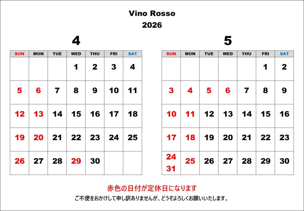 お知らせ NEWS 2026/04/01 4月・5月営業日のお知らせ 新着お知らせ 価格改定のお知らせ 2月・3月営業日のお知らせ クリスマスディナー2025予約受付中 12月のパーティーコース 12月・1月営業日のお知らせ 10月・11月営業日のお知らせ 8月・9月営業日と臨時休業のお知らせ 臨時休業のお知らせ